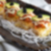 Tempura shrimp, cucumber, & avocado topped with salmon & hiram sashimi, lemon, lime, green onions & ponzu sauce.$16.6516.65 USD